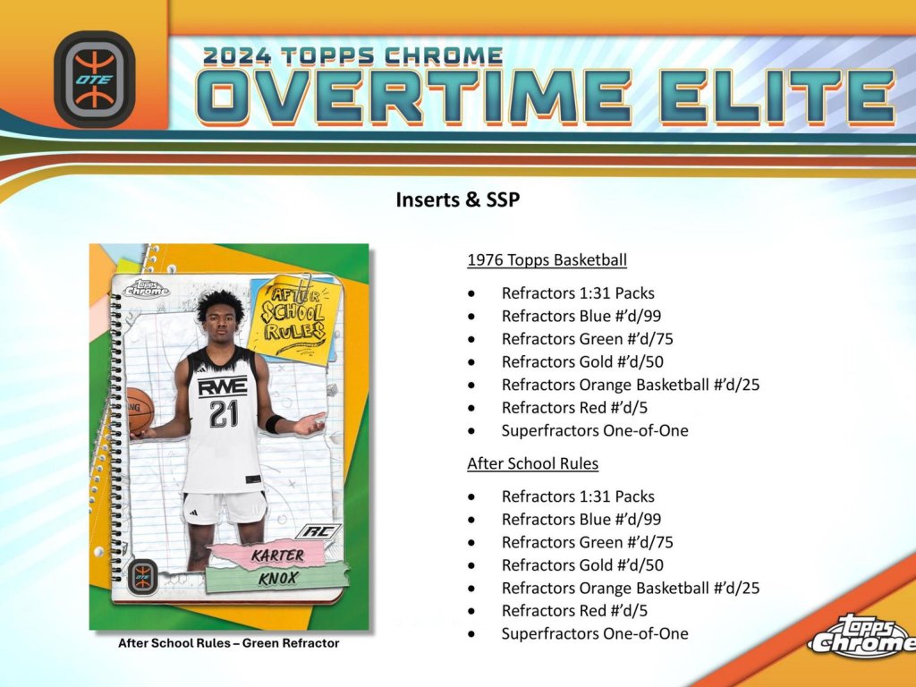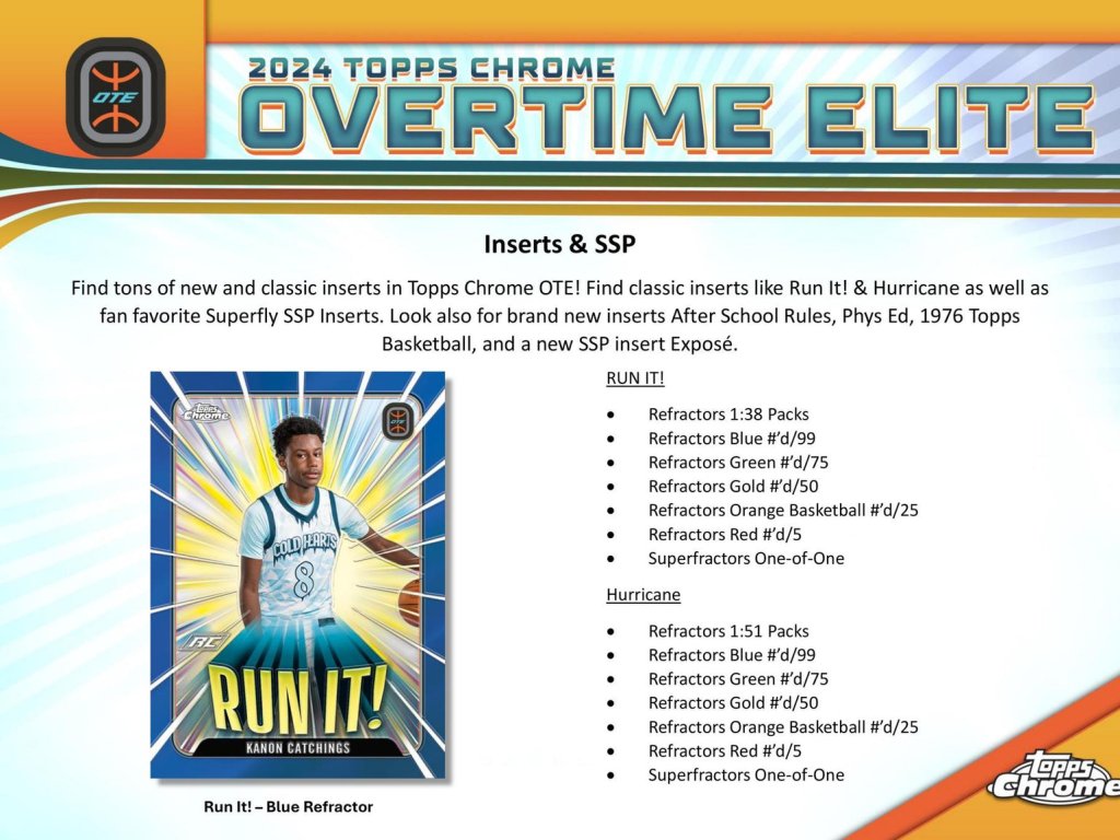Najděte spoustu nových i klasických insertů v Topps Chrome OTE! Najděte klasické inserty jako Run It! & Hurricane a také oblíbené Superfly SSP. Podívejte se také na zcela nové After School Rules, Phys Ed, 1976 Topps Basketball a nový insert SSP Expose.