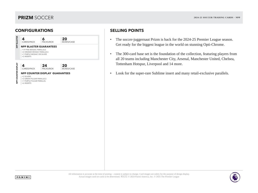 2024-25 Panini Prizm Premier League EPL Hobby Blaster Box obsahuje celkem 24 karet (6 balíčků po 4 kartách) Každá krabice obsahuje 19 exkluzivních modrých mosaic prizm, dvě...