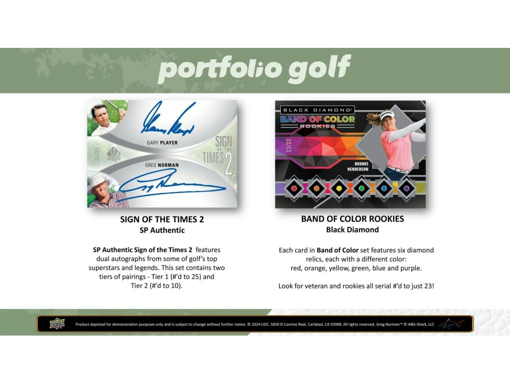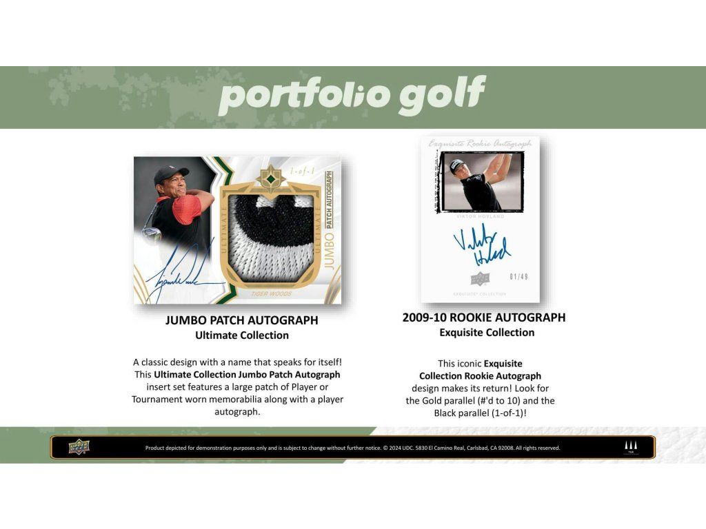 Hitové autogramy nejvyšší kvality! Kolekce Exquisite Collection a SP Authentic obsahují některé z nejikoničtějších designů autogramů od UD. Hledejte sadu autogramů pro nováčky z kolekce Exquisite Collection 2009-10, která obsahuje některé z nejlepších golfových nováčků. Sada SP Authentic Sign of the Times 2 obsahuje dva autogramy od některých z největších jmen tohoto sportu... včetně legend.