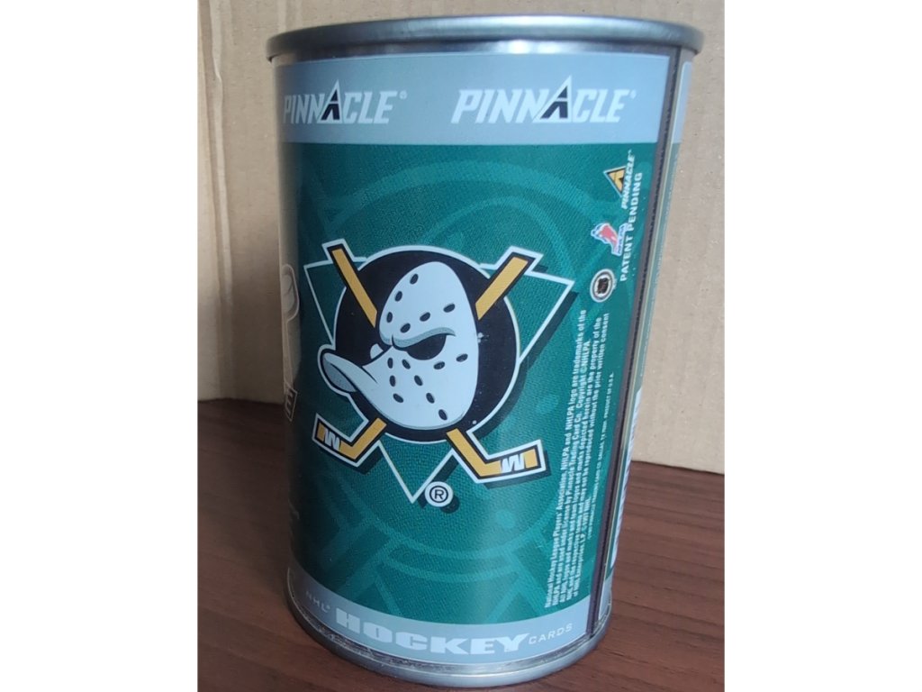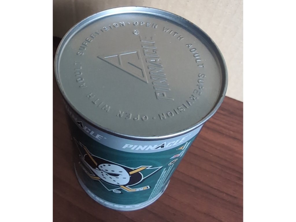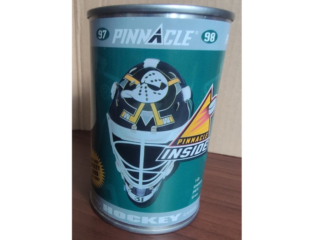 Uvnitř najdete 10 náhodných hokejových karet z této ikonické série. Pinnacle v roce 1997 přišlo s unikátní prezentací a místo klasických boxů zvolilo stylové plechovky s motivy známých hráčů NHL.