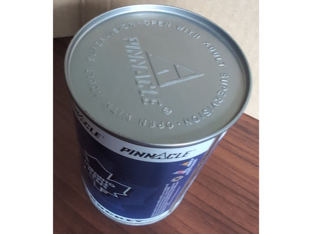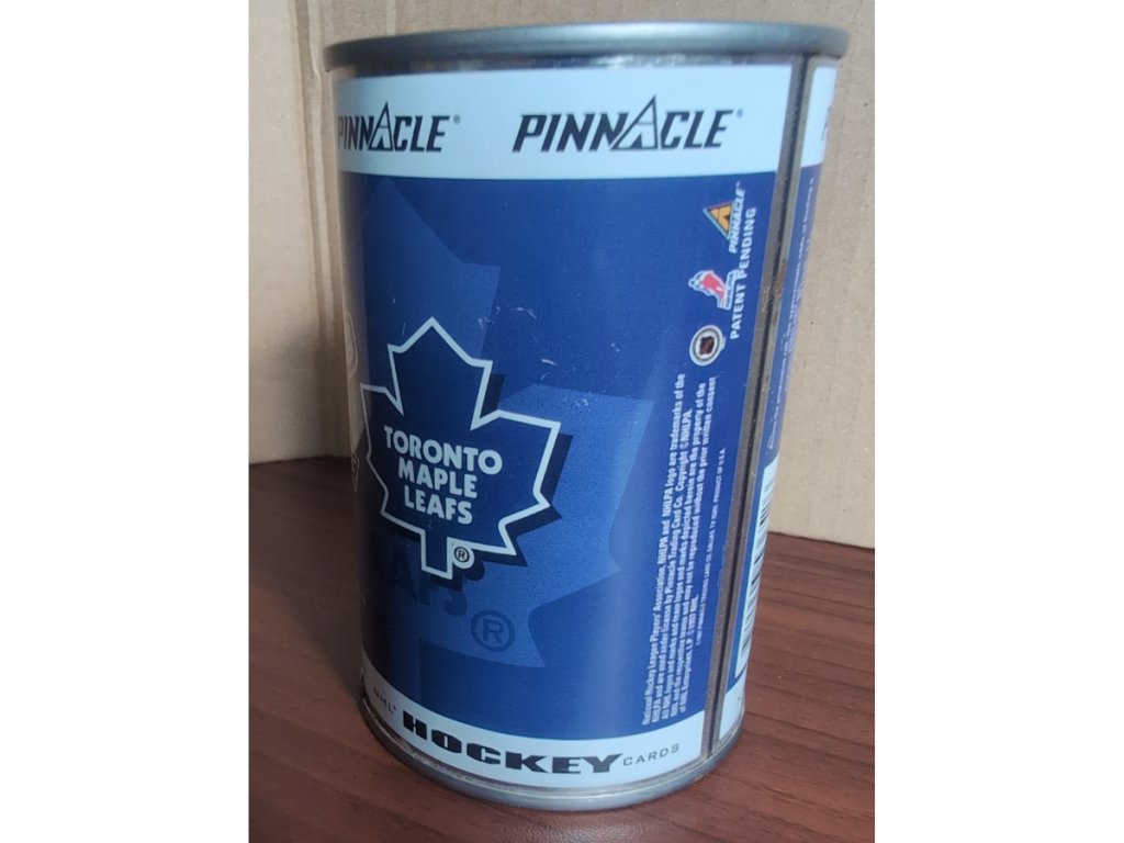 Uvnitř najdete 10 náhodných hokejových karet z této ikonické série. Pinnacle v roce 1997 přišlo s unikátní prezentací a místo klasických boxů zvolilo stylové plechovky s motivy známých hráčů NHL.