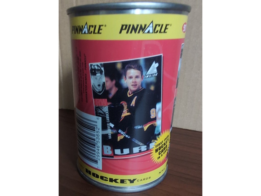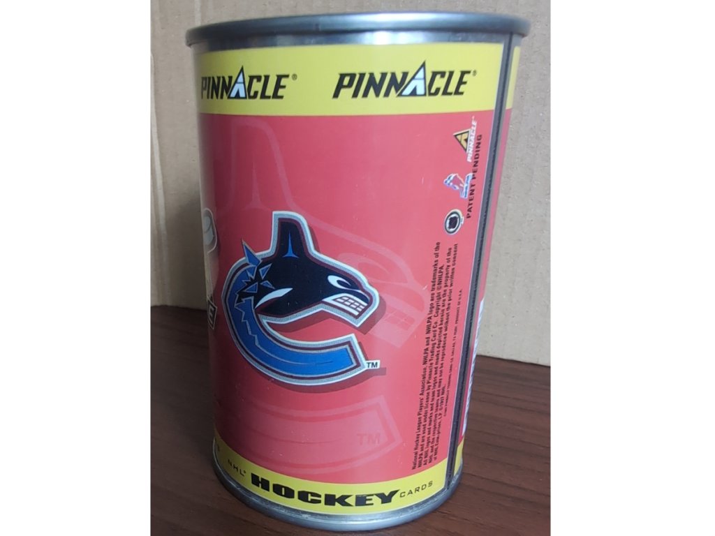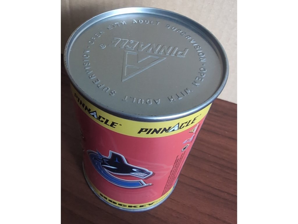 Uvnitř najdete 10 náhodných hokejových karet z této ikonické série. Pinnacle v roce 1997 přišlo s unikátní prezentací a místo klasických boxů zvolilo stylové plechovky s motivy známých hráčů NHL.
